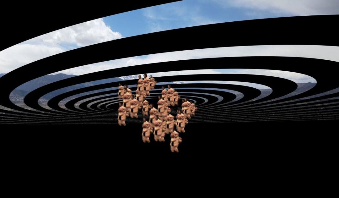 About five years ago, she created a character for herself named Venus. She put on an elaborate costume and programmed her drone to record her performing as Venus. Now she’s taken the Venus form and worked it into animation. Her new installation, “Venus: A Space to Hold, Redeemer, I,” features a feminine-shaped brown blob that she’s inserted into three new videos featuring a Colorado Springs neighborhood and the Rocky Mountains.