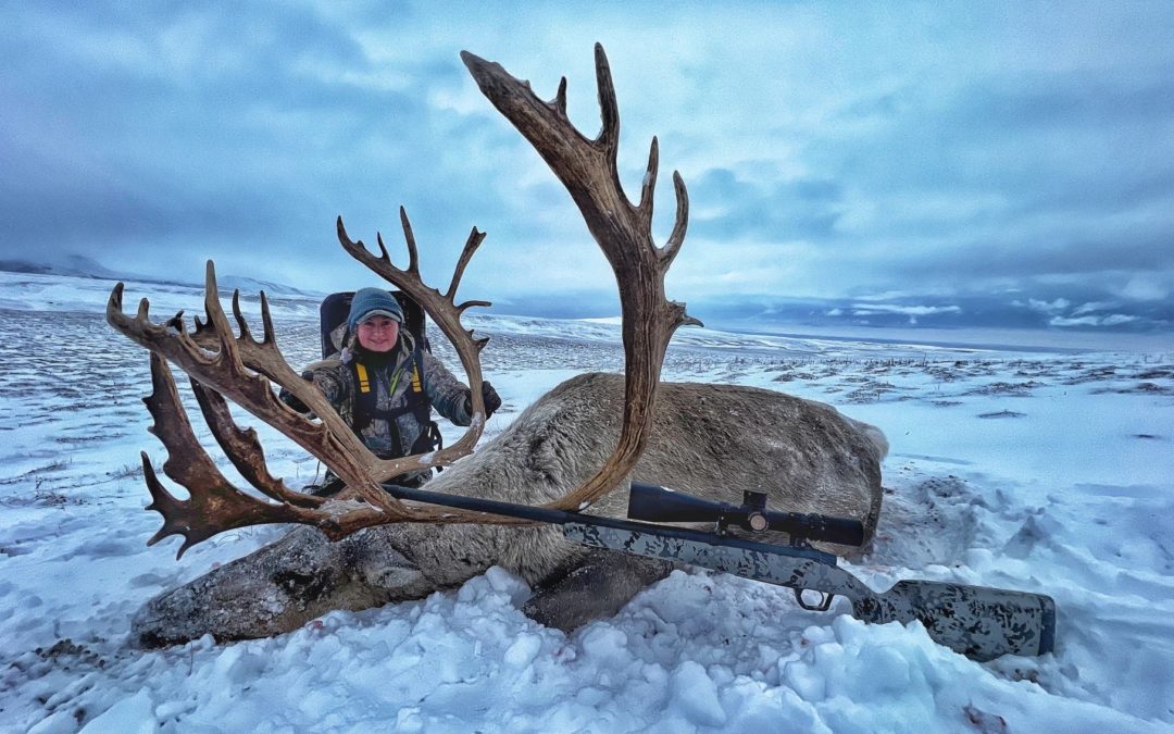 “We were at the top of this tiny little bump knoll, and if we’d tried to get closer it would have put us at a bad angle,” Sallenbach says. “The caribou were already looking at us, the storm was coming, and if we scared them off, we weren’t going to have time to chase them. It was shoot or go home. Mark kept saying, ‘If you’re comfortable take the shot.’ I had the bull in my sights, I felt comfortable and everything was absolutely perfect.” The longest shot she has ever taken turned out to also be one the cleanest, Sallenbach says. “I don’t think I even hit a bone, except maybe nicking a rib on the exit wound.”
