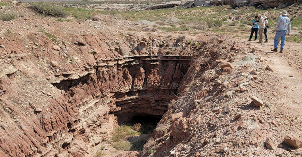 Mary Young and Ian Shafer, of Grand Junction, Colorado, worked for three years as contractors doing field surveys before being hired by the DOE as DRUM project managers. During the September tour, they showed how their four-member field survey team—including an ecologist, a geologist, a radiologist, and a lead person—walk the boundaries of a disturbed area to collect information prior to safeguarding the site. Surveyors look for debris, erosion, waste rock piles, nearby drainages where offsite migration of contaminants may occur, and areas where there’s a sudden sinking in the soil (called a subsidence)—where the ground caves-in beneath your feet and can cause injuries to humans and wildlife. At this Yellow Cat site, there’s an underground maze of tunnels created by miners in search of ore—tunnels that contribute to the earth’s instability here. DRUM teams also note the size and number of openings in the mines.
