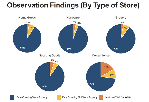 The lowest face-covering usage was spotted at convenience stores with about 73% of individuals observed properly wearing masks and 84% total wearing coverings properly.