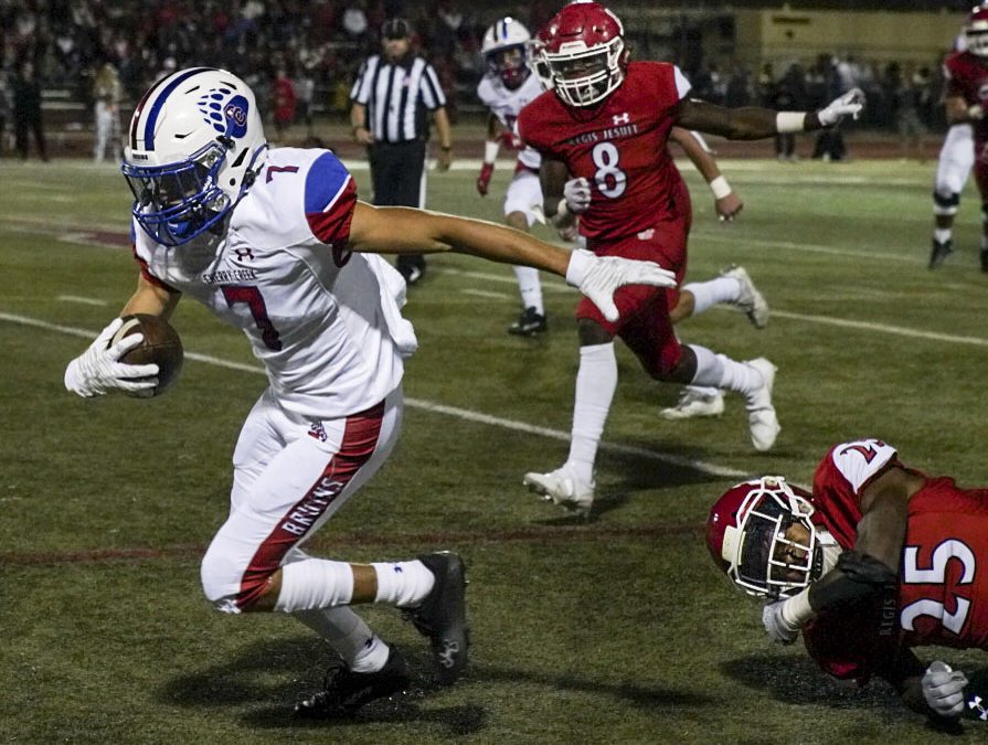 The two-time defending 5A champion Bruins open league play against a Cougars team riding a three-game win streak. The Bruins have won 26 straight against Colorado teams and five in a row vs. CT. Creek’s stout defense will be challenged by a Cougars attack anchored by CU-bound tackle Travis Gray and an array of weapons that include QB Logan Brooke (1,242 passing yards, 16 TDs), WR Jack Pierce (31 receptions, 506 yards) and RB Ciaran Hyslop (97 carries, 639 yards).