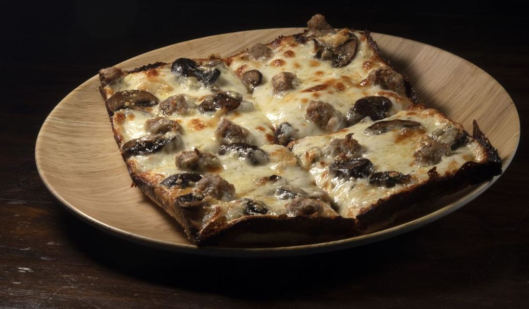 Certainly, the name should have been my first clue. The pies are baked in rectangular steel pans. The result is a thick, chewy and crispy crust with toppings placed right to the edge, so there’s no rim.