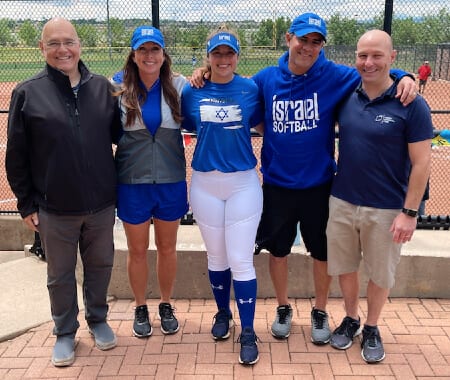 Sydney Silverstein, center, is flanked l-r by Ami Baran, executive director of Israel Softball; coach Leah Amico; head Coach Adam Glickman; and Matt Leebove, associate director, JNF Mountain States, at the Triple Crown in Westminster.