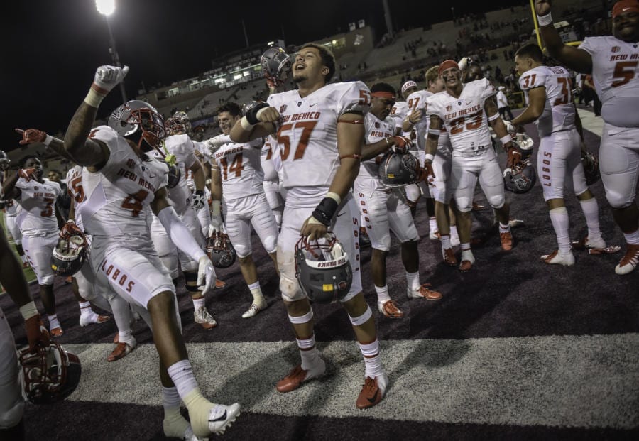 Lobo players celebrate in the end zone after defeating the Aggies in Las Cruces in 2018. (Roberto E. Rosales/Albuquerque Journal)